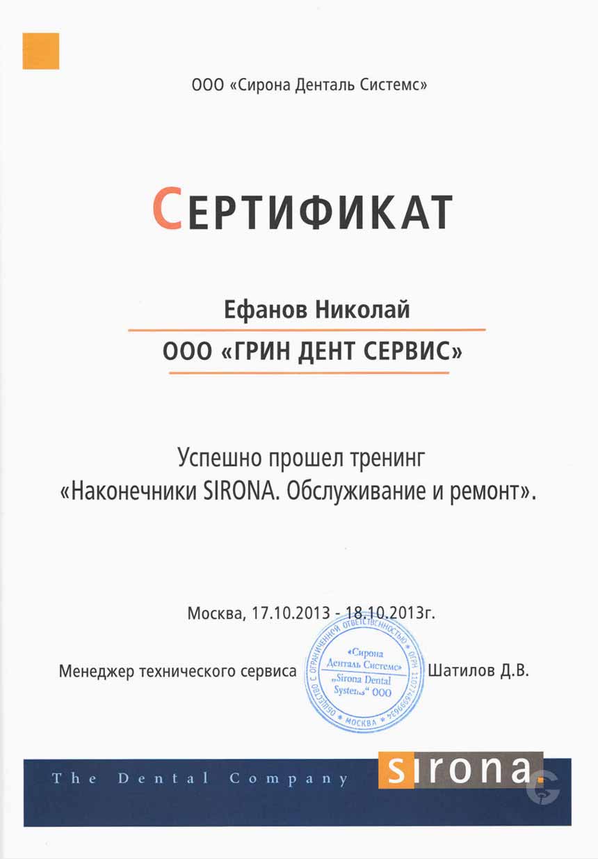 Инженер компании ООО «ГРИН ДЕНТ СЕРВИС», Ефанов Николай Владимирович, успешно прошел тренинг по ремонту и обслуживанию наконечников SIRONA.
